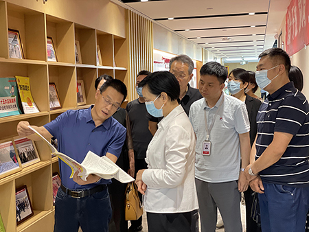 黨支部書(shū)記、董事長(zhǎng)張振民向來(lái)訪領(lǐng)導(dǎo)介紹企業(yè)現(xiàn)狀及運(yùn)營(yíng)模式,并帶領(lǐng)陳主席一行了解了朝霞文化的圖書(shū)產(chǎn)品。