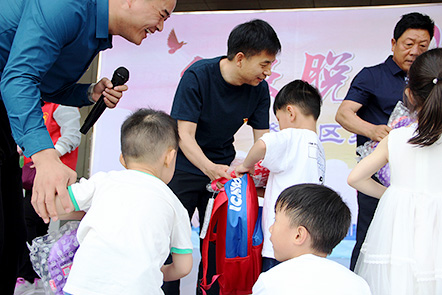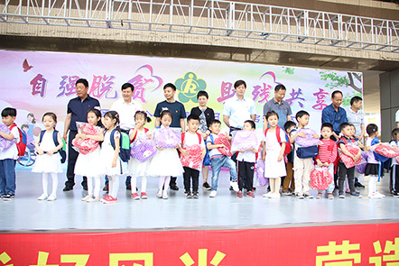 洛陽朝霞文化股份有限公司總經(jīng)理劉紅橋上臺為孩子們發(fā)送紀(jì)念品